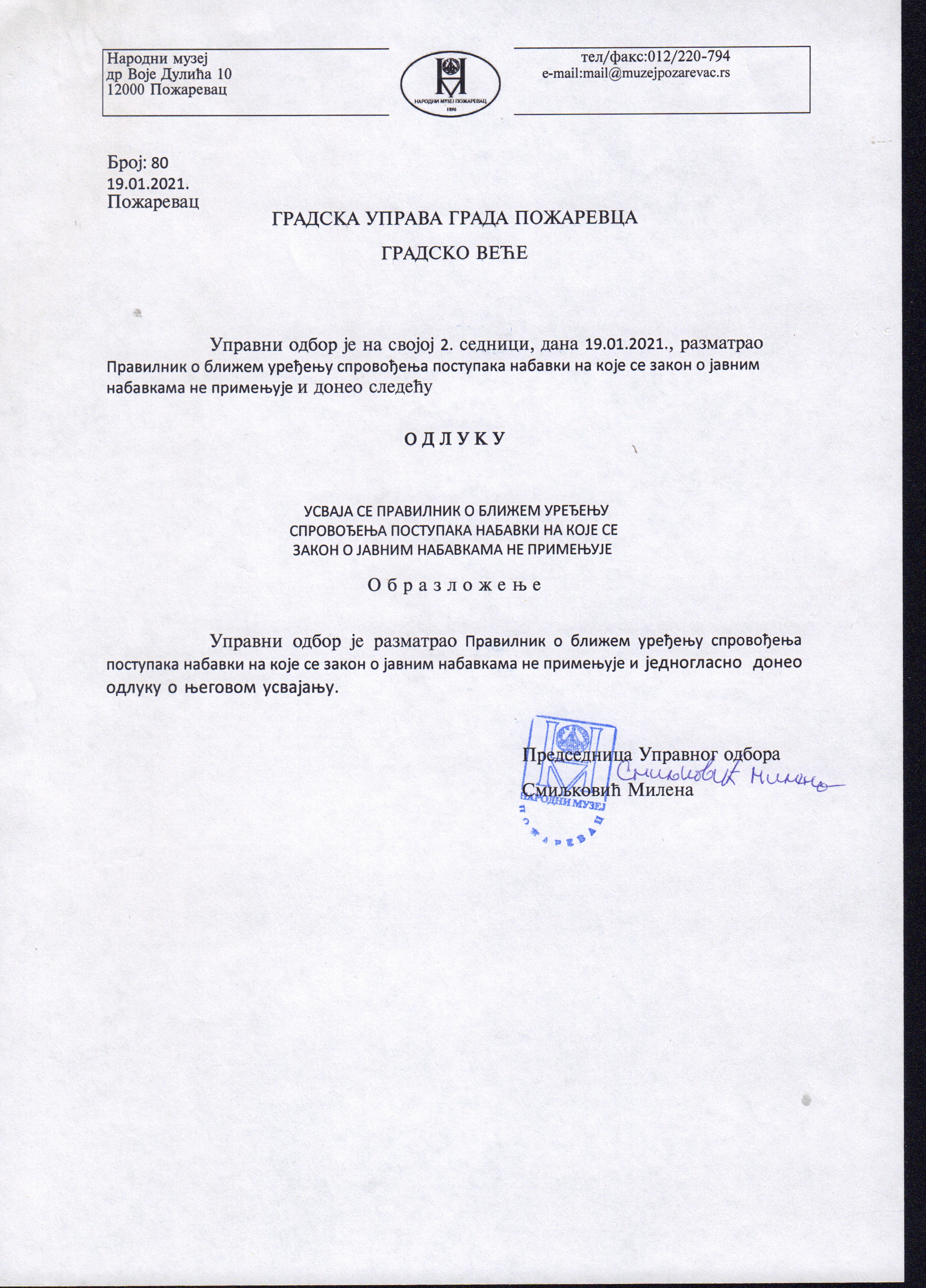 Одлука о усвајању правилника о ближем уређењу спровођења поступака набавки на које се закон о јавним набавкама не примењује